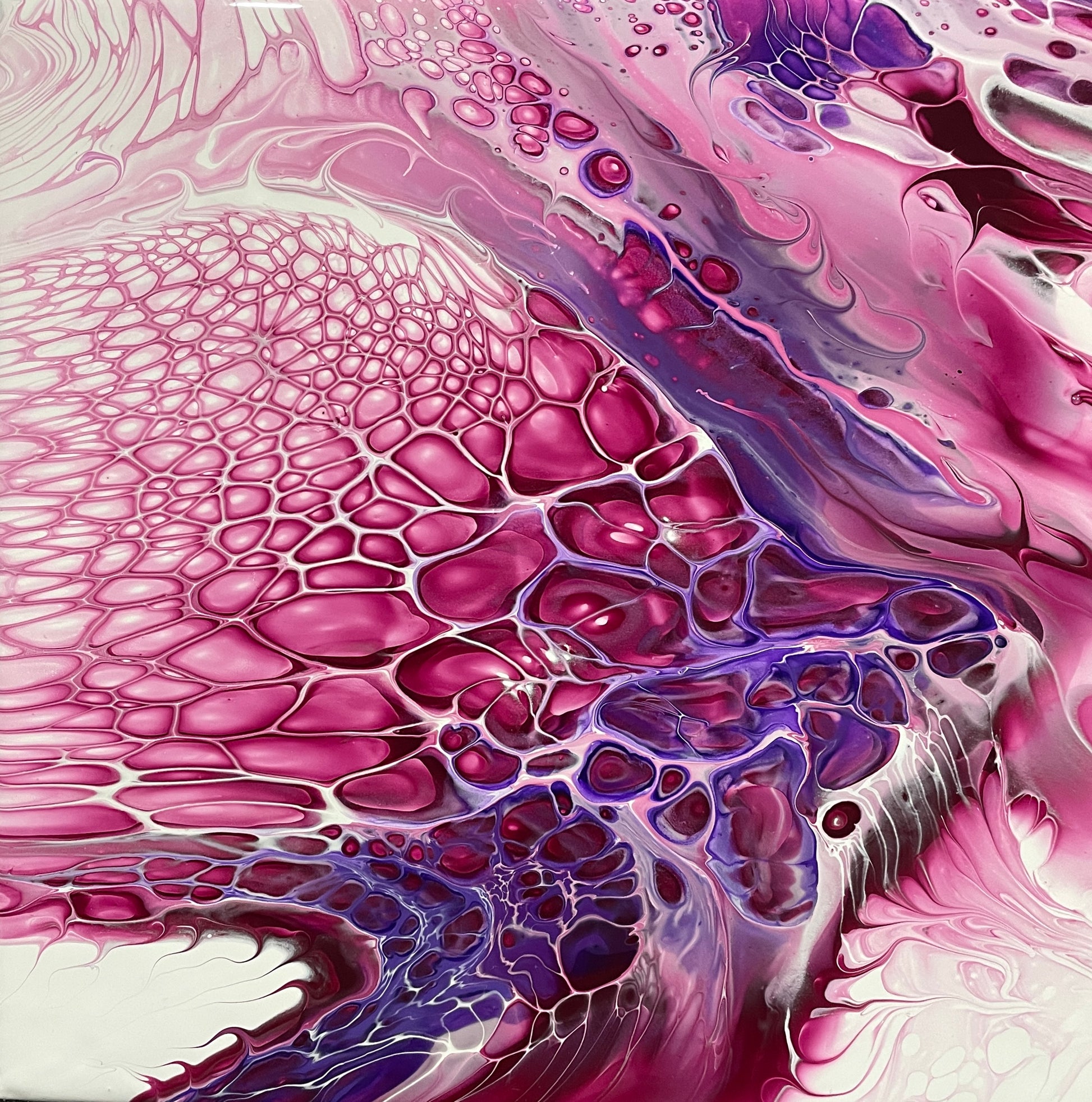 Amethyst Web radiates with the raw elegance of organic expansion, fusing hues of violet, lavender, deep plum, and soft whites into a mesmerizing floral explosion. The composition evokes the visual poetry of a blooming orchid or an energetic burst of geode crystals, rendered through masterful use of fluid acrylic pouring and controlled cell creation.