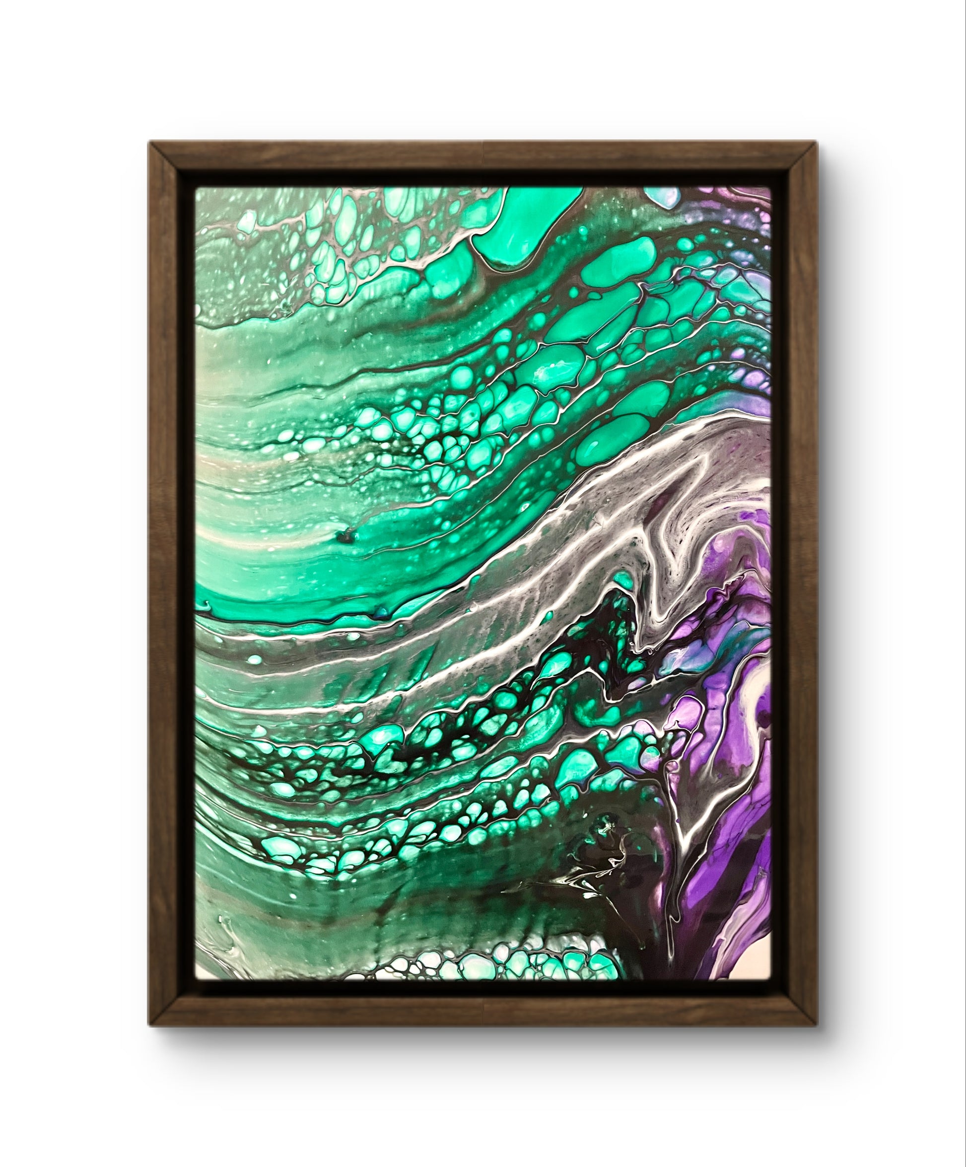 Tidal Bloom is a dynamic 305 mm x 230mm acrylic fluid artwork that captures the essence of an underwater world in motion. Vivid emerald greens cascade and swirl like ocean currents, interwoven with inky blacks and highlighted by flashes of soft grey and vibrant violet.
